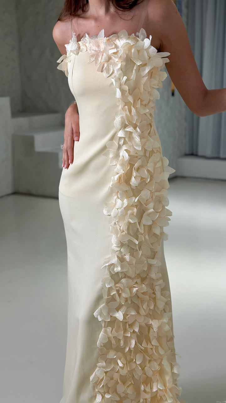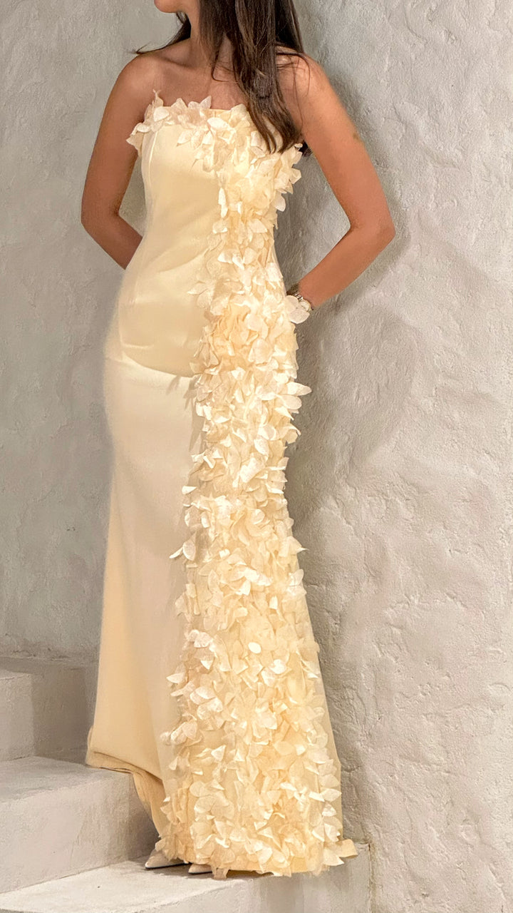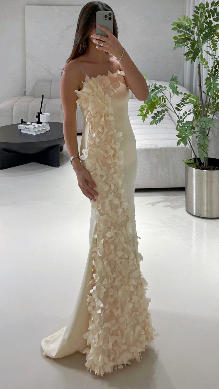Elegant and soft — Bloom features a beige-yellow satin that glows with warmth and charm. Delicate floral details add a touch of romance, while the fitted bodice and smooth silhouette create a graceful, feminine shape. A timeless piece that captures beauty in every detail.