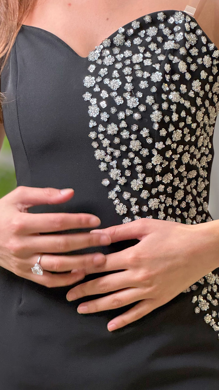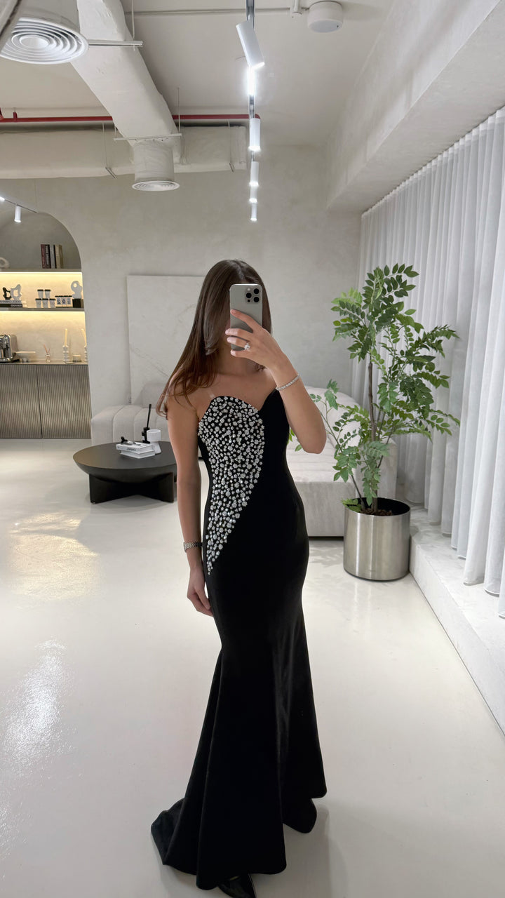 Elegant and powerful — Midnight features a deep satin tone that reflects light with every movement. The beaded bodice adds a refined touch of shimmer, flowing into a smooth, structured satin dress that defines the waist and elongates the silhouette. Designed to balance strength and softness, Midnight embodies timeless evening elegance.