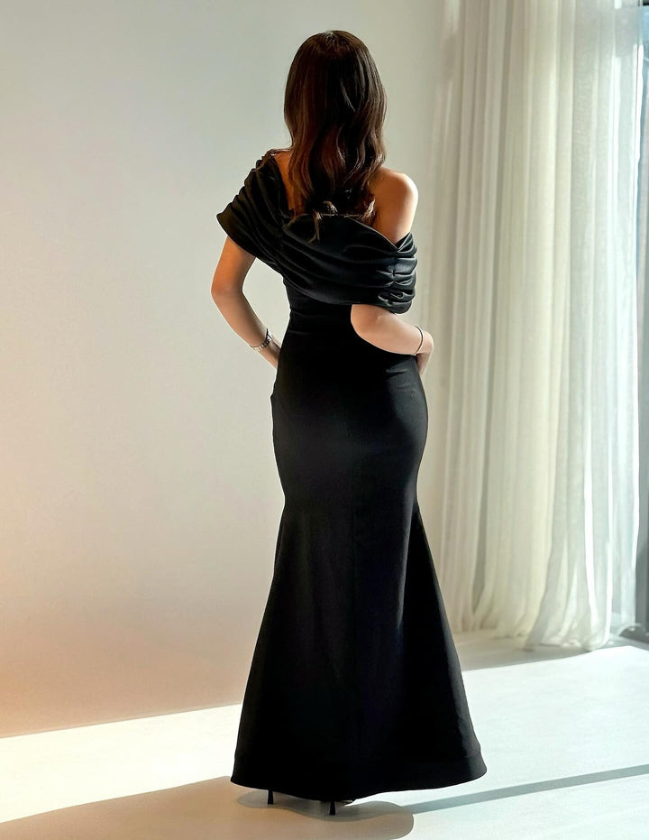 The Classic Line Dress embodies timeless elegance with its off-shoulder neckline and sleek, structured silhouette. Designed in a rich black tone, it features a side slit for effortless movement and a touch of modern charm. Perfect for formal evenings, special occasions, or celebrations, this gown combines sophistication and confidence — available in custom sizes for a flawless fit.