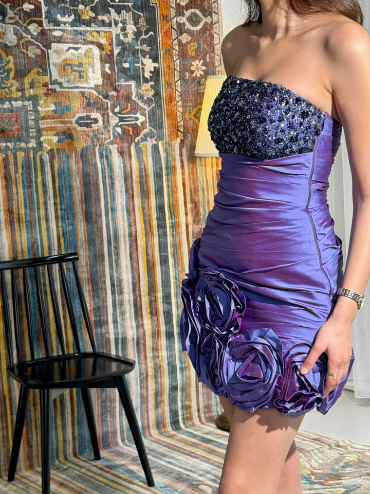 The Mini Bloom Dress features a fitted silhouette with an embellished bodice and sculpted floral details along the hem. Designed in a rich purple tone, it blends playful elegance with a modern edge — perfect for parties, special occasions, or evening events. Crafted from smooth, high-quality fabric for a flattering fit.