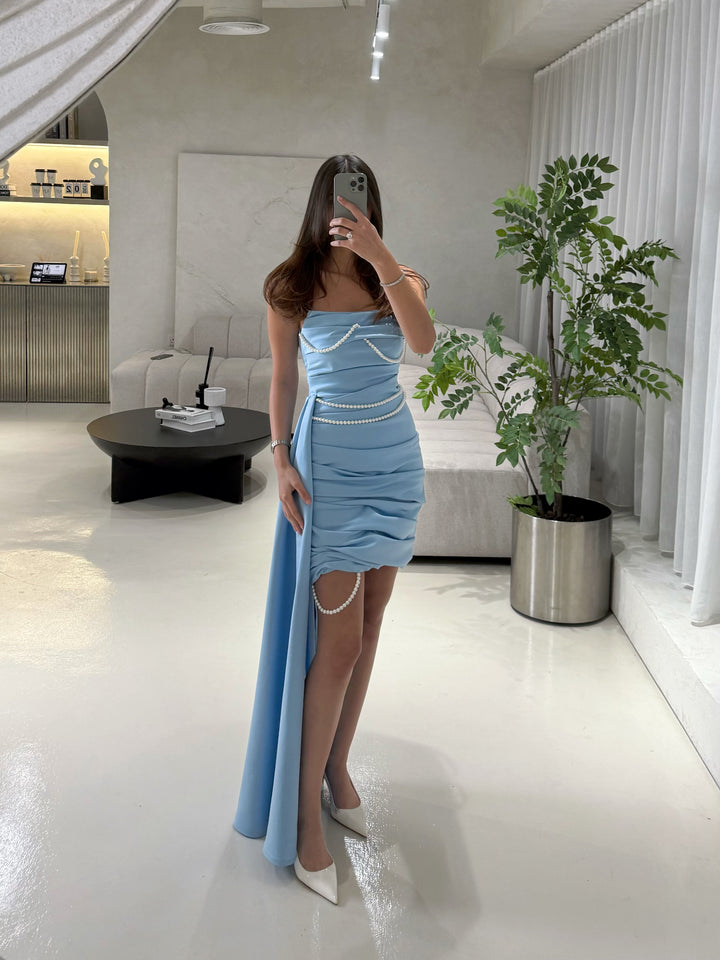 Soft and striking — Sky is crafted from smooth sky-blue satin, detailed with pearls that trace the bodice and waist. The ruched design and detachable train create an elegant, sculpted silhouette. A graceful balance of structure and flow.