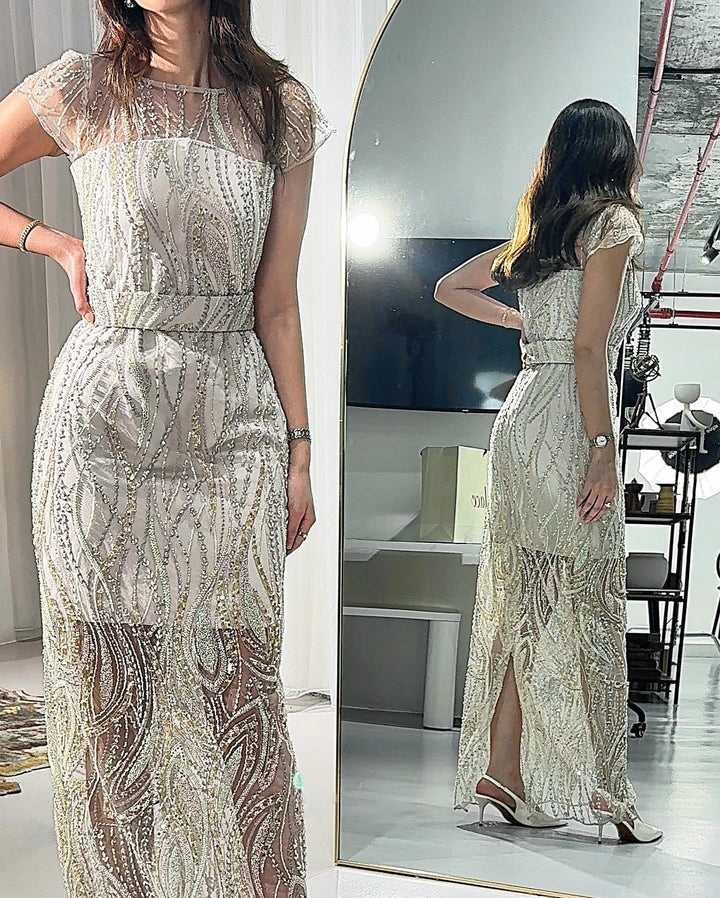 The Crystal Wave Dress features a fitted silhouette with shimmering beadwork over an off-white base, creating a soft, refined glow. Perfect for wedding guests and evening occasions, it blends elegance, comfort, and timeless design.